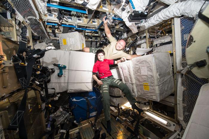 2015年1月,欧洲航天局和美国航空航天局的宇航员在ATV-5自动货运飞船内,飞船内有一些太空垃圾。