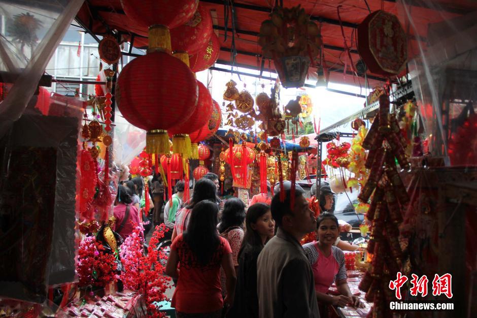 2月17日,中国传统节日春节即将来临,位于印尼雅加达北区班芝兰的唐人街,几周前就摆满年货,走进街头巷尾随处可见:绣上羊年吉祥的鲜艳唐装、七彩桃花、红艳艳的灯笼、红包袋、春联、中国结与各种糖果水果等节日商品摆满街旁,四处洋溢着浓浓的喜庆年味。不断涌来购置年货的华人,这几天把这条街挤得水泄不通,热闹非凡。顾时宏 摄
