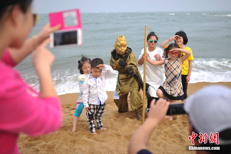 2月19日,农历羊年正月初一,海南琼海玉带滩景区,“孙悟空”向游客拜年并讨要红包,引起众多游客围观合影。 中新社发 韦亮 摄