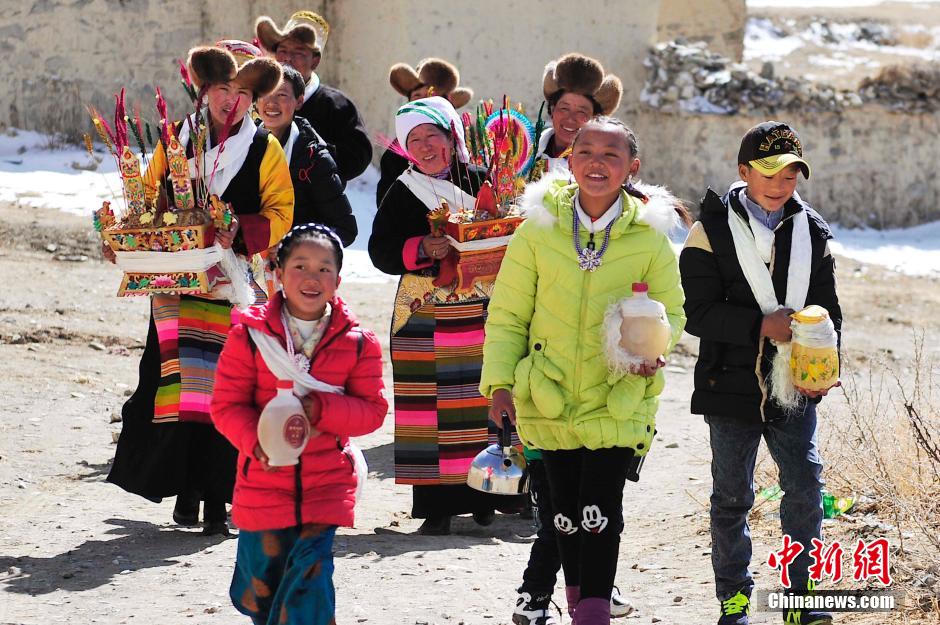 19日,藏历新年和农历春节大年初一,在距离拉萨市区约40公里的达孜村,天空作美下起了瑞雪,当地民众按照习俗,端着切玛,提着青稞酒挨家挨户去拜年,图为村民们结队去拜年。唐朝杨 摄