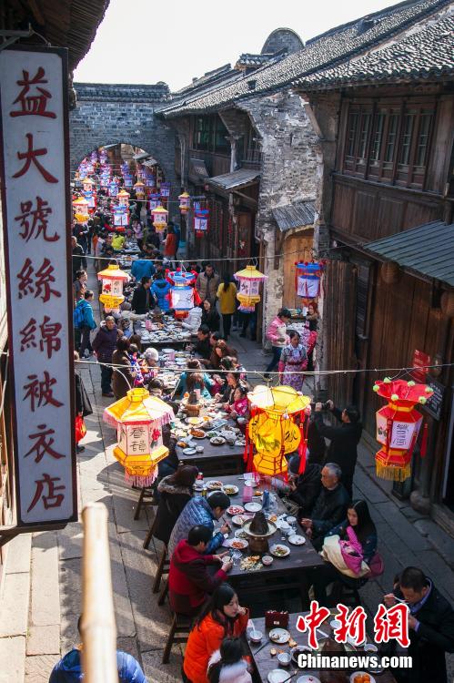 2月19日,是中国农历的大年初一。从今天开始,连续5天的“春节长街宴”在浙江省乌镇西栅老街上举办,连绵数百米、数以千计的游客聚在一起用餐,宛如一道别有情趣的风景。据了解,“长街宴”是乌镇民间独有的庆典形式,它的根深扎在民间老百姓中。中新社发 张雄伟 摄