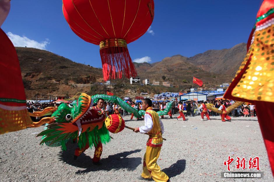 2015年2月19日,云南省昭通市鲁甸县地震灾区的安置点里,受灾群众煮汤圆、吃年饭、耍龙灯,穿上了节日盛装,表演自编自演的文艺节目,红红火火庆祝新年的到来,呈现出了浓浓的年味。 中新社发 张广玉 摄