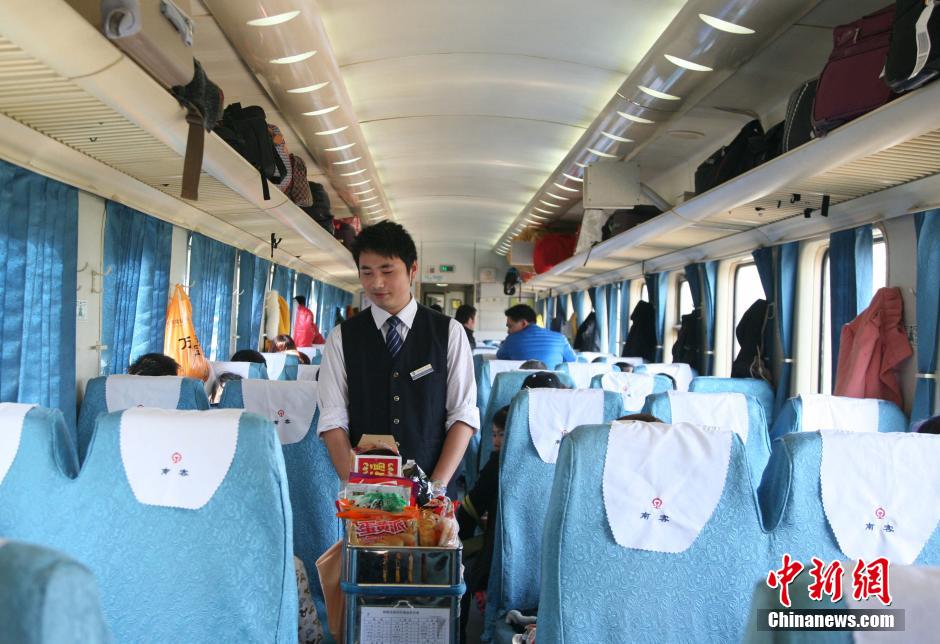 2月19日,在上海开往桂林的K149列车上,乘务员推着装满小吃零食的货架穿过漫长的过道,为有需要的旅客提供热情的服务,鲜有人知,从车头到车尾,一趟看似简单的流动服务,乘务员们却要走上整整3个小时。这是一趟青春洋溢的列车,从车长到乘务员,平均年龄在35左右。今年春节,他们没有回家,全部坚守在岗位上。看着一拨拨旅客平安到站,他们笑称“这个春节过得值了”。中新社发 李晨韵 摄