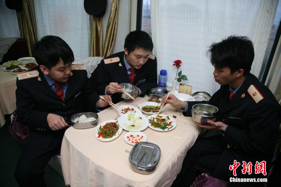 2月19日,在上海开往桂林的K149列车上,乘务员趁着短暂的休息时间简单地解决了一餐,等待他们的还有漫长旅途中各项服务工作。鲜有人知,从车头到车尾,一趟看似简单的流动服务,乘务员们却要走上整整3个小时。这是一趟青春洋溢的列车,从车长到乘务员,平均年龄在35左右。今年春节,他们没有回家,全部坚守在岗位上。看着一拨拨旅客平安到站,他们笑称“这个春节过得值了”。中新社发 李晨韵 摄