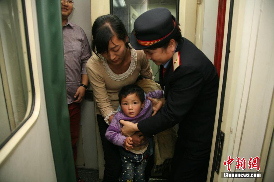 2月19日,在上海开往桂林的K149列车上,乘务员帮助一位母亲扶好年幼的孩子,以防在行进的列车内跌倒。鲜有人知,从车头到车尾,一趟看似简单的流动服务,乘务员们却要走上整整3个小时。这是一趟青春洋溢的列车,从车长到乘务员,平均年龄在35左右。今年春节,他们没有回家,全部坚守在岗位上。看着一拨拨旅客平安到站,他们笑称“这个春节过得值了”。中新社发 李晨韵 摄