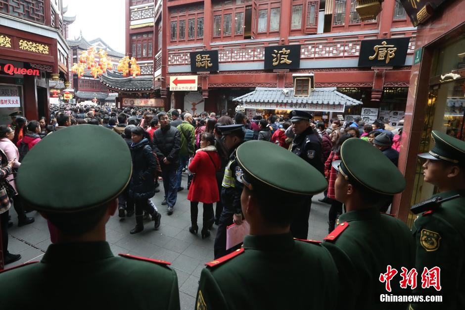 2月20日,在上海城隍庙景区,武警战士在人流容易出现交织拥堵的路口执勤,一旦出现拥挤状态,立刻采取限行分流,确保平安春节。中新社发 泱波 摄