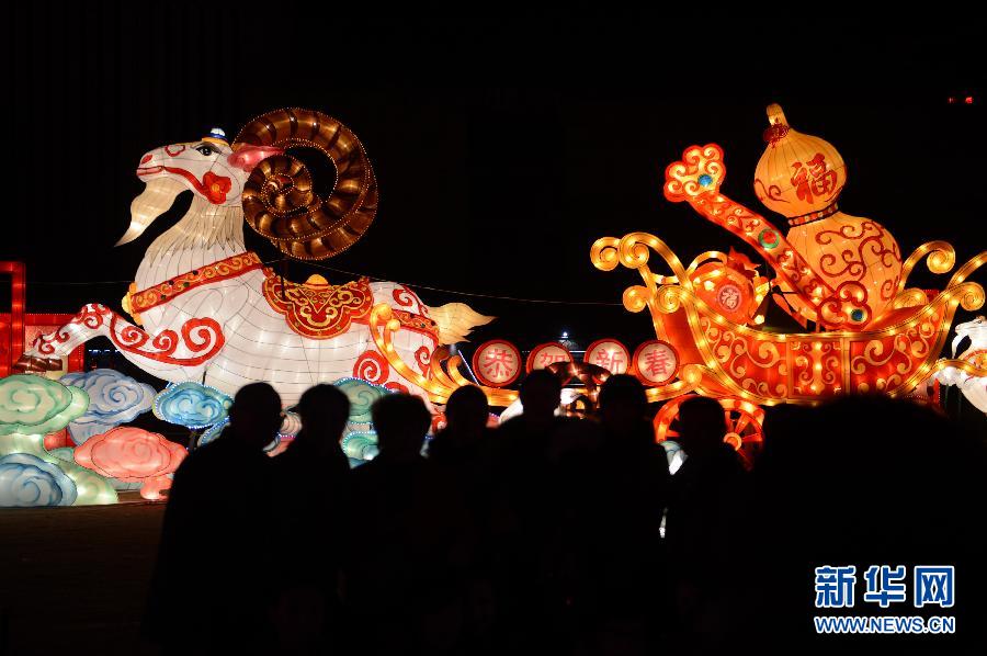 2月22日,市民们在观赏羊造型的花灯。春节期间,青海省西宁市张灯结彩,璀璨夺目的花灯给高原古城带来浓郁的节日气氛。 新华社记者张宏祥摄
