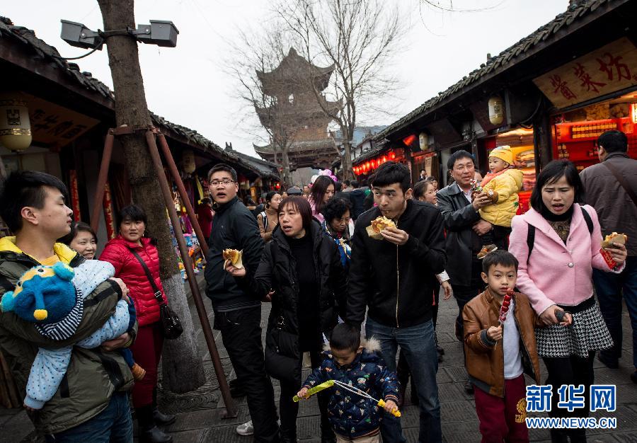 2月22日,游客在阆中古城游览。四川阆中美食文化源远流长,回、汉、满多民族饮食文化汇聚,发展出保宁醋、保宁蒸馍和张飞牛肉等代表性的美食,春节期间吸引很多游客前来品尝。新华社记者江宏景摄