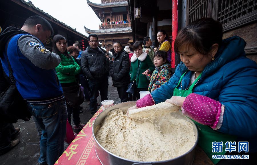 2月22日,一名商贩在阆中古城制作龙须酥。四川阆中美食文化源远流长,回、汉、满多民族饮食文化汇聚,发展出保宁醋、保宁蒸馍和张飞牛肉等代表性的美食,春节期间吸引很多游客前来品尝。新华社记者江宏景摄