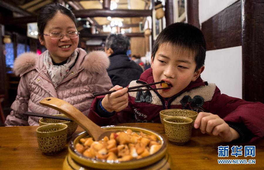 2月22日,一位小朋友在阆中古城品尝阆中三绝汤。四川阆中美食文化源远流长,回、汉、满多民族饮食文化汇聚,发展出保宁醋、保宁蒸馍和张飞牛肉等代表性的美食,春节期间吸引很多游客前来品尝。新华社记者江宏景摄