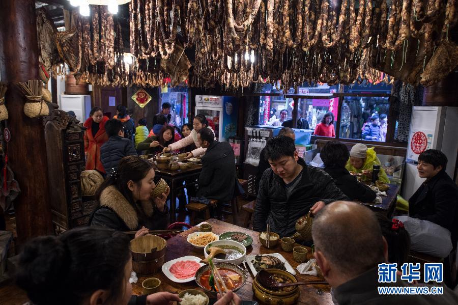 2月22日,游客在阆中古城一家特色餐馆吃午饭。四川阆中美食文化源远流长,回、汉、满多民族饮食文化汇聚,发展出保宁醋、保宁蒸馍和张飞牛肉等代表性的美食,春节期间吸引很多游客前来品尝。新华社记者江宏景摄