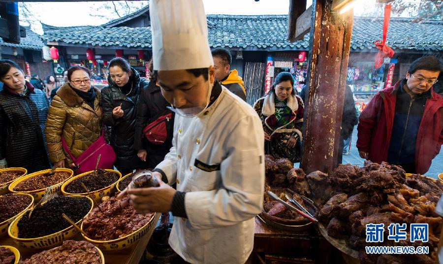 2月22日,游客在阆中古城选购牛肉等特产。四川阆中美食文化源远流长,回、汉、满多民族饮食文化汇聚,发展出保宁醋、保宁蒸馍和张飞牛肉等代表性的美食,春节期间吸引很多游客前来品尝。新华社记者江宏景摄