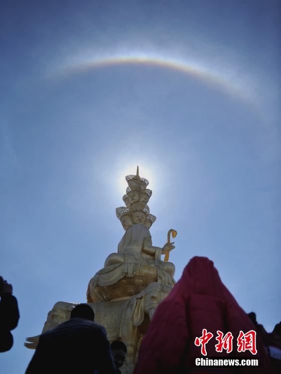 2月22日,峨眉山金顶出现奇特天气景观,四方普贤坐像上方天空出现罕见的日晕天象,持续时间仅10分钟左右。 中新社发 刘忠俊 摄