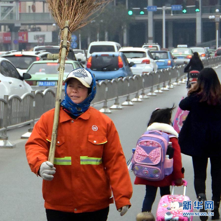 一位环卫工人扛着清扫工具走在郑州街头(2月20日摄)。新华社记者 王颂 摄