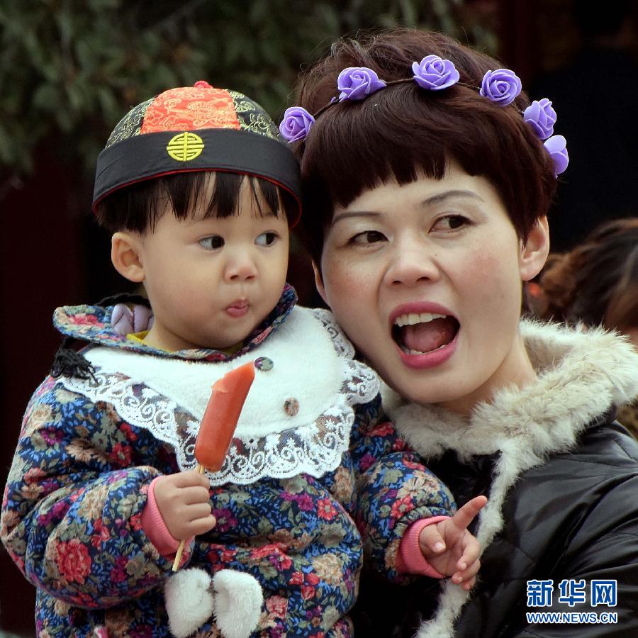 在开封龙亭大宋上元灯会会场,一位游客带着孩子游园赏灯(2月19日摄)。新华社记者 王颂 摄