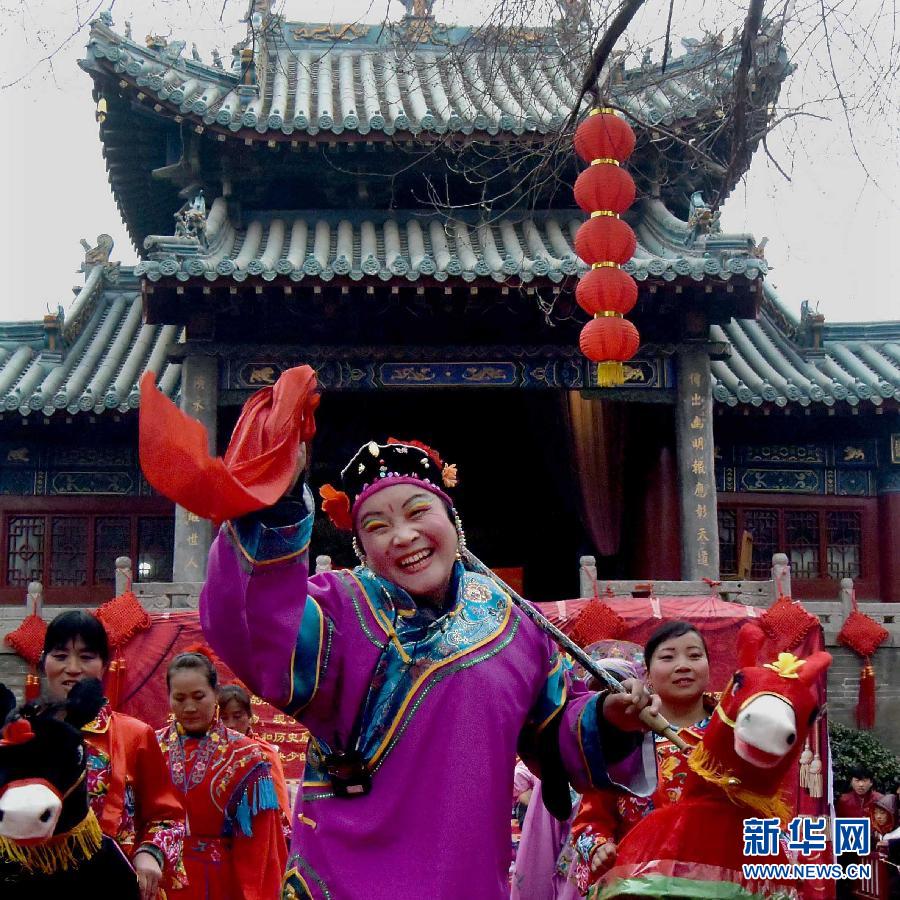 在郑州城隍庙会上,一位高跷演员在表演中与观众互动(2月23日摄)。新华社记者 王颂 摄