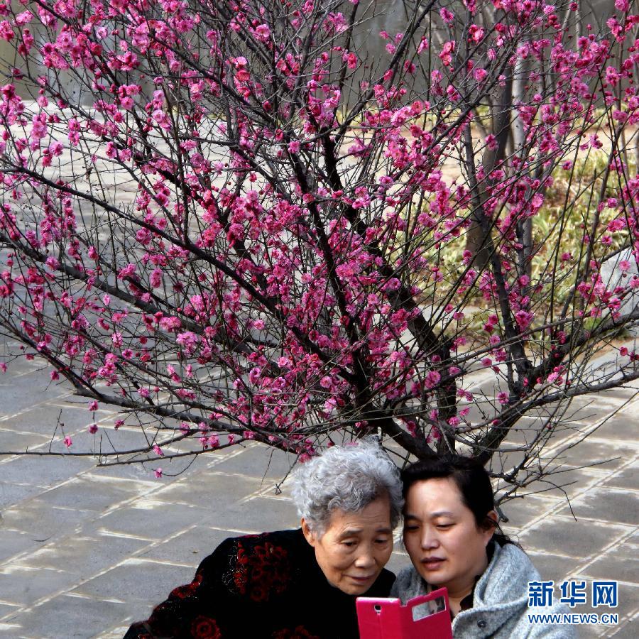 在洛阳市隋唐城遗址公园梅园,一位市民和母亲一起翻看刚拍的照片(2月21日摄)。新华社记者 王颂 摄