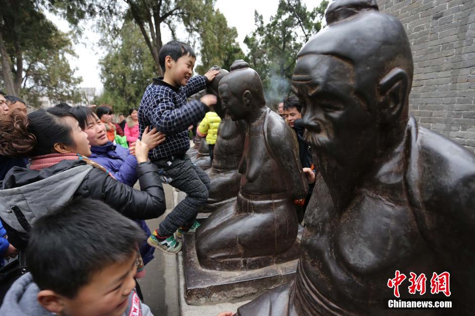 2月23日,大年初五,游客在河南淮阳太昊陵内的岳飞观前打“秦桧”。在太昊陵内的岳飞观前,跪着奸臣王俊、万俟、秦桧、秦桧妻王氏、张俊等5人铁铸像,凡是参观岳飞观的游客都会到这儿打“秦桧”,以泄对杀害民族英雄岳飞的仇恨,数百年以来,铁铸像被人们拍打的光光亮亮。据淮阳县志记载,抗金名将岳飞曾三次收复陈州(今淮阳),故人们在太昊陵内建庙纪念。杨正华 摄