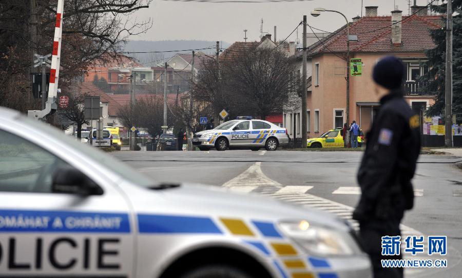2月24日,在捷克东部城市乌赫尔斯基布罗德,警察在发生枪击事件的餐馆附近巡逻。 当日,这里发生枪击事件,造成至少8人死亡。新华社/美联
