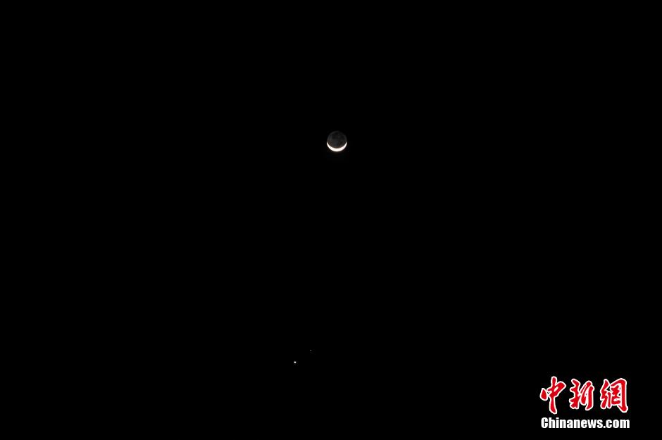 2月21日,昆明地区天气晴朗,傍晚19点左右,金星和火星在天空上演“双星伴月”的美丽天象。 中新社发 任东 摄