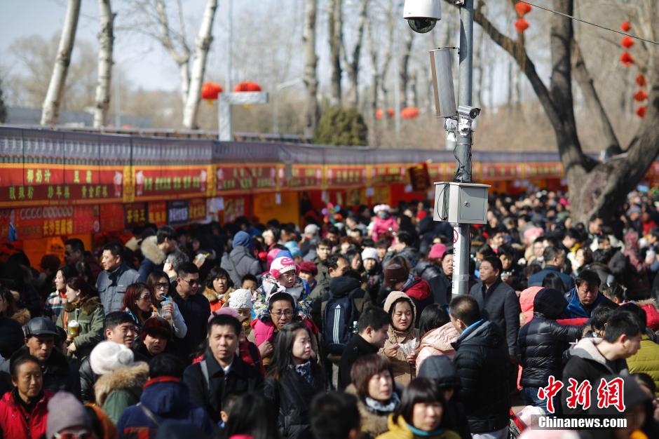 2月22日,北京龙潭公园庙会上熙熙攘攘的人群从摄像头下走过。今年,北京龙潭公园庙会现场安装了27个可以360度旋转的探头(摄像头),以确保市民度过欢乐、安全的春节庙会。 中新社发 盛佳鹏 摄