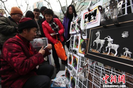 街头艺人用易拉罐编织工艺品三阳开泰。 张亨伟 摄