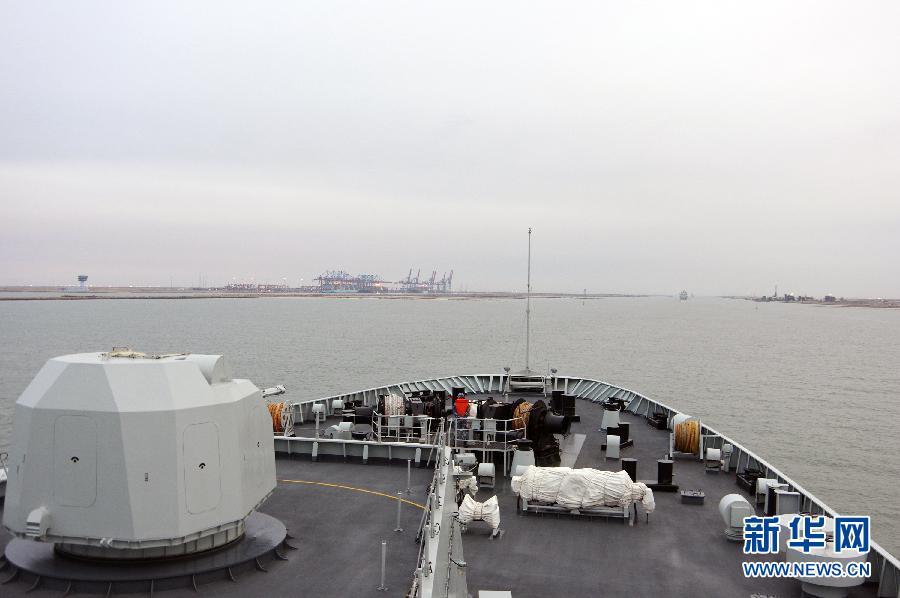 2月23日傍晚,中国海军第十八批护航编队长白山舰驶入埃及苏伊士运河。由两栖登陆舰长白山舰、导弹护卫舰运城舰以及综合补给舰巢湖舰组成的中国海军第十八批护航编队在圆满完成亚丁湾索马里海域护航及欧洲五国访问任务后,于24日凌晨通过埃及苏伊士运河返航。新华社发 肖永 摄 图片来源:新华网