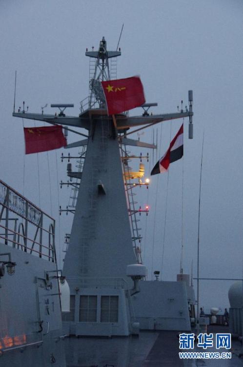 2月23日傍晚,中国海军第十八批护航编队长白山舰驶入埃及苏伊士运河时悬挂起埃及国旗。由两栖登陆舰长白山舰、导弹护卫舰运城舰以及综合补给舰巢湖舰组成的中国海军第十八批护航编队在圆满完成亚丁湾索马里海域护航及欧洲五国访问任务后,于24日凌晨通过埃及苏伊士运河返航。新华社发 肖永 摄 图片来源:新华网
