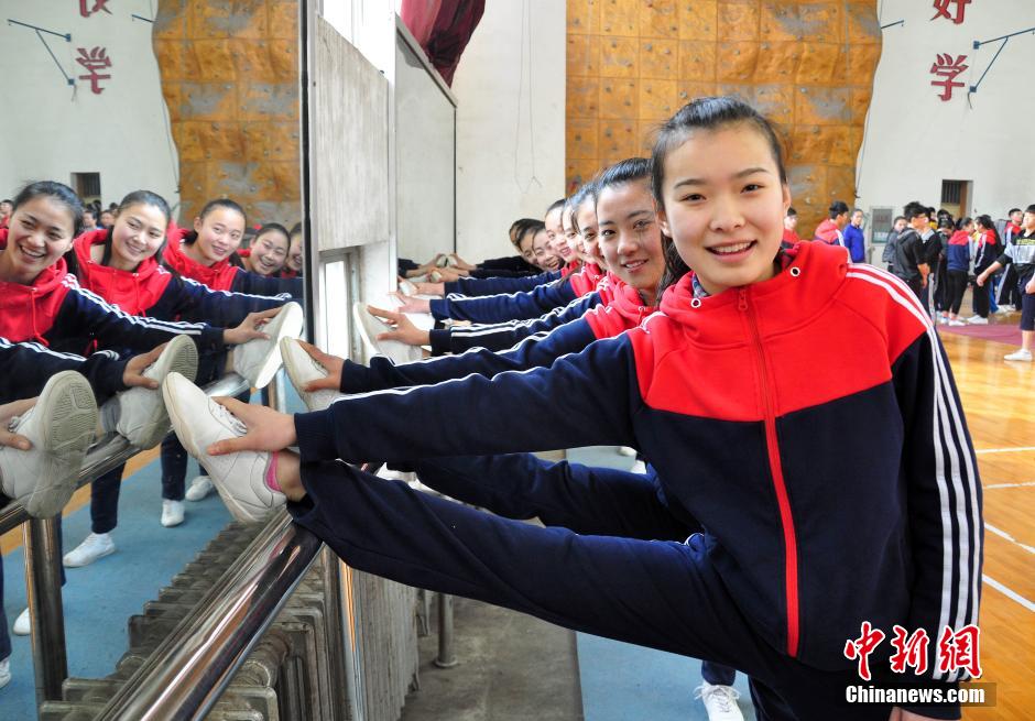 2月25日,在聊城一家艺考培训中心,老师辅导考生进行艺术类表演专业健美操专项(竞技健美操)的柔韧训练。艺考在即,山东省多所培训中心迎来准备报考艺术类表演专业的高三学生接受成套操化、难度动作、过渡衔接等方面的强化培训,考生利用寒假加紧训练,为“艺考”考出好成绩打下基础。近年来,山东省高三学生另辟蹊径,加入“艺考”大军的人数正逐年递增。中新社发 许文豪 摄