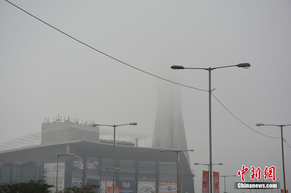 2月25日,大雾笼罩澳门,当地地标性景点旅游塔“隐身不见”。中新社发 王国安 摄