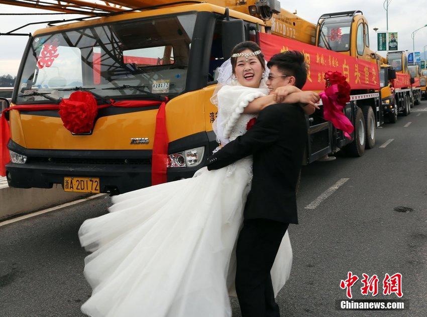 2015年2月24日,新年初六,杭州市淳安县城出现了壮观的起重机迎亲队伍,一辆辆清洗的干干净净的起重机车上挂着大红花,贴着“喜”字,拉着“恭贺新郎新娘百年好合”、“恭贺新郎新娘百头偕老”等字样的横幅,在街头上赚足眼球。该车队由4辆重型起重机车组成,阵容既奇葩又豪华。新郎谢江建说,这场婚礼所用的起重机车其中2辆是自己所有,另2辆由朋友提供。每辆价值90万左右,用这种方式迎娶新娘,不比奔驰、宝马掉价,而且更霸气更拉风。葛跃进 摄