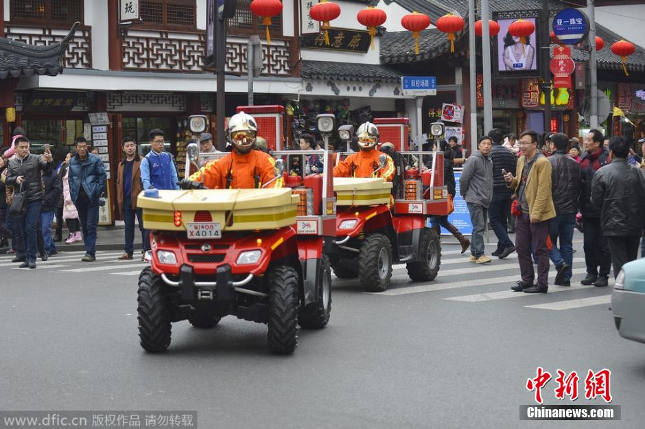 2015年2月24日,上海,羊年初六的城隍庙,上海市消防局外滩中队的摩托消防车在人群中尤为引人注目。春节期间根据保卫任务,外滩消防车从除夕至元宵节担任豫园地区巡防任务。时间从早晨到深夜,摩托消防车为1人担任驾驶员和战斗员。陈明松 摄 图片来源:东方IC 版权作品 请勿转载