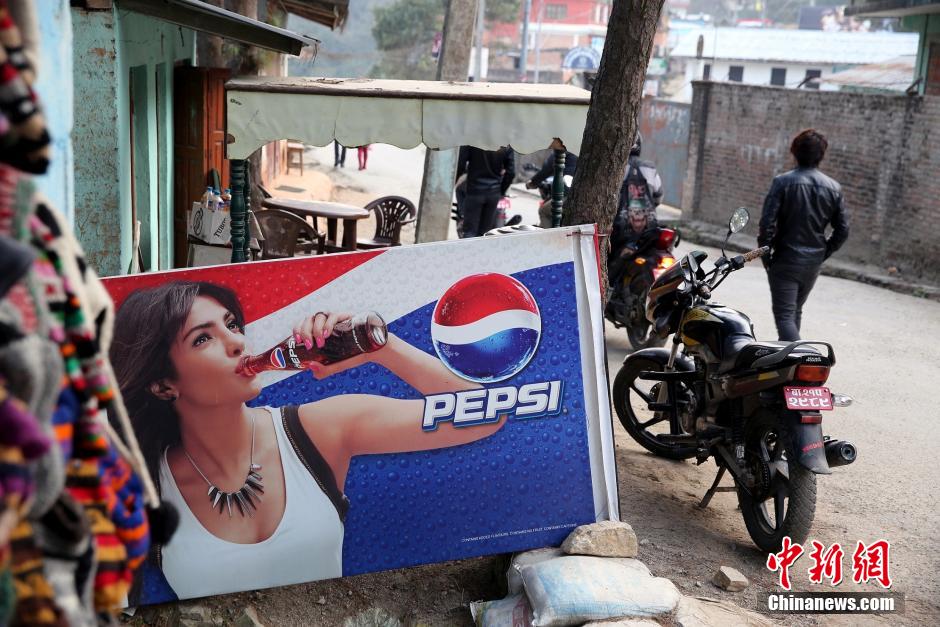 2月21日,尼泊尔那加阔特镇街头的一处饮料广告。“高山之国”尼泊尔位于喜马拉雅山南麓,其绝大多数居民生活在群山之中。由于交通不便、环境恶劣、能源匮乏等原因,尼泊尔山区普遍面临经济落后、生活水平较低等问题。而近年来,随着国际游客逐渐增多,尼泊尔一些山村尤其是临近著名景区的村落迎来现代化“浪潮”,手机、电视及来自世界各国的红酒出现在人们的生活中。在许多蜿蜒而上的山路两旁,游客们不时可看到时尚、性感的“吸睛”广告。中新社发 符永康 摄