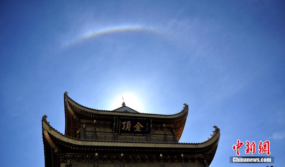 2月22日,峨眉山金顶出现奇特天气景观,四方普贤坐像上方天空出现罕见的日晕天象,持续时间仅10分钟左右。 中新社发 刘忠俊 摄