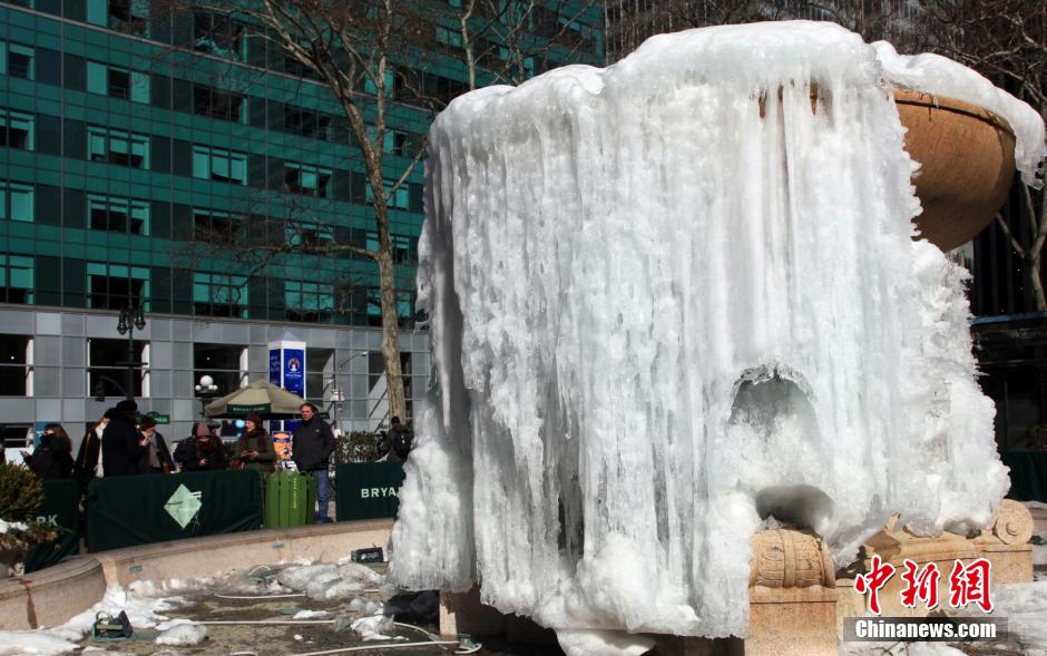 纽约连遭低温冰冻天气袭击,纽约著名的布莱恩公园喷泉已经冻成“冰泉”。24日,美国东部和北部地区再次受极地寒流影响,多个地区创下了低温纪录。国家气象部门指出,全美本土50个州中有48个州都会被冰雪覆盖,在过去一个星期,全美已有34人因为暴风雪和低温等恶劣天气死亡。中新社发 阮煜琳 摄