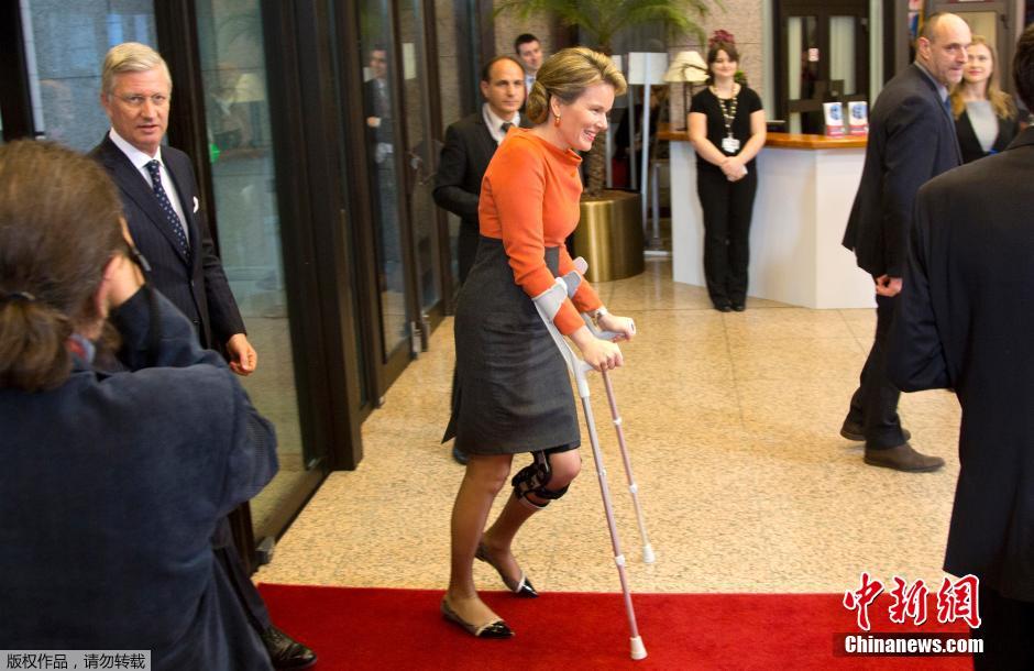 当地时间2015年2月25日,比利时布鲁塞尔,比利时国王菲利普偕王后玛蒂尔德访问欧洲议会大厦,收到了欧洲议会主席马丁-舒尔茨和欧盟委员会主席容克的热烈欢迎。图为比利时王后玛蒂尔德杵着拐杖出席欢迎仪式。
