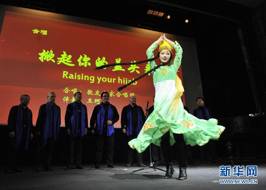 2月25日,在比利时布鲁塞尔自由大学举办的“布鲁塞尔春节联欢晚会”上,演员在表演歌舞。