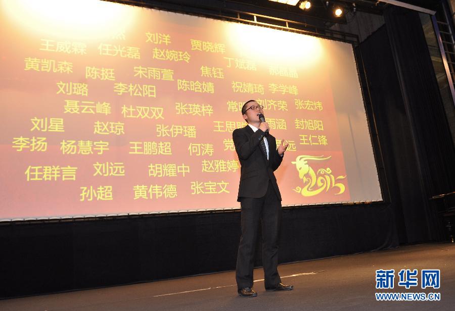 2月25日,在比利时布鲁塞尔自由大学举行的“布鲁塞尔春节联欢晚会”接近尾声时,布鲁塞尔中国学生学者联合会负责人刘洋致辞,感谢所有参与晚会筹备工作的中国留学生志愿者,他们的名字显示在屏幕上。新华社记者叶平凡摄