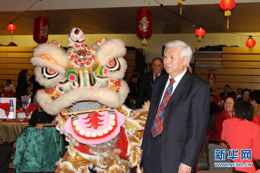 2月24日晚,英国苏格兰中部华人联会会长李罗安在福尔柯克市举行的庆新春联欢会上观看舞狮。羊年春节前后,苏格兰华侨华人和当地主流社会举行了多场迎新春、庆新春的活动。 新华社记者郭春菊摄