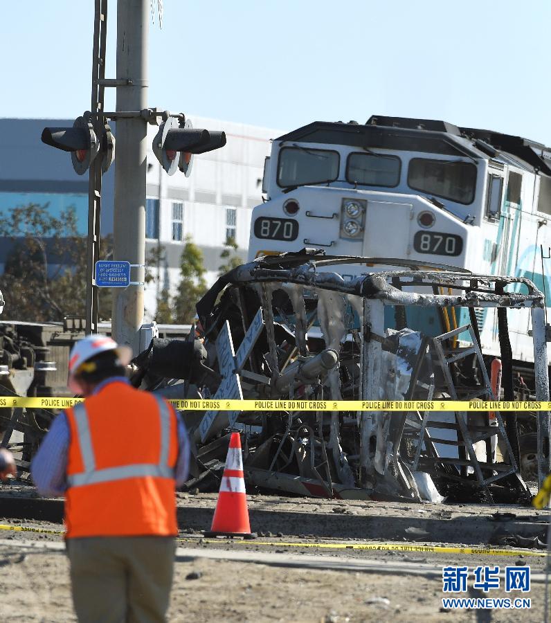 这是2月24日在美国加州南部奥克斯纳德市拍摄的被烧毁的货车残骸(前)和脱轨列车。美国加州南部奥克斯纳德市附近24日晨发生一列轻轨列车与停在轨道上的一辆货车相撞事故,造成至少30人受伤。这列轻轨列车当时正从文图拉县开往洛杉矶。事故造成多节轻轨车厢出轨,3节倾倒。新华社/美联