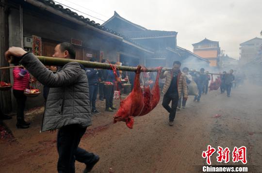 2月21日,一支送亲队伍挑着贺礼行经广西三江侗族自治县林溪镇程阳村大寨鼓楼 龚普康 摄