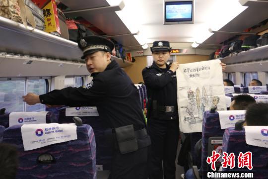 2月22日,在广西柳州市开往广州南的D3651次列车上,南宁铁路公安局柳州铁路公安处民警,将亲手绘制的一组漫画版春运提示送给乘客,漫画内容涉及动车禁烟知识及春运反扒。