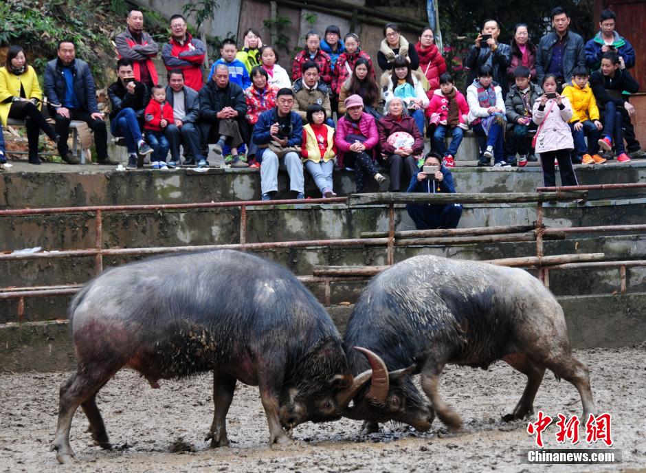 2月22日,广西三江侗族自治县举办新春牛王争霸赛,精彩节目引来众多游客前来观赏。侗族同胞自古喜爱斗牛,每年春节、三月三及中秋节等节庆期间均会举办斗牛比赛,祈福来年喜获丰收。杨明 摄