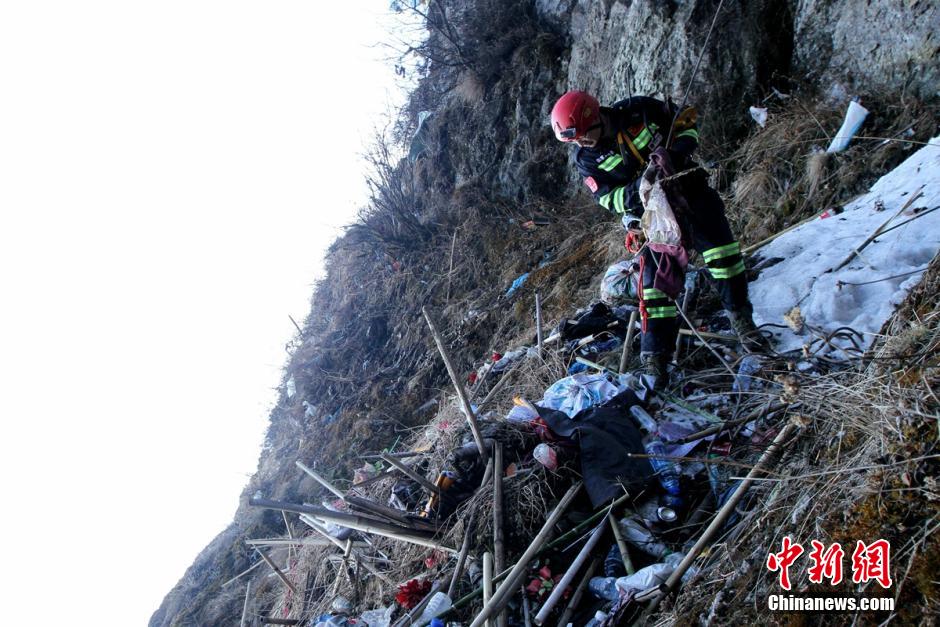 2月22至23日,四川山地应急救援队的“蜘蛛侠”们来到峨眉山金顶,深入舍身崖下200多米处捡拾游客丢弃的塑料瓶和塑料袋等白色垃圾,通过捡拾行动提醒广大游客不要随便乱扔垃圾,爱护和保护景区环境,做文明游客。刘忠俊 摄