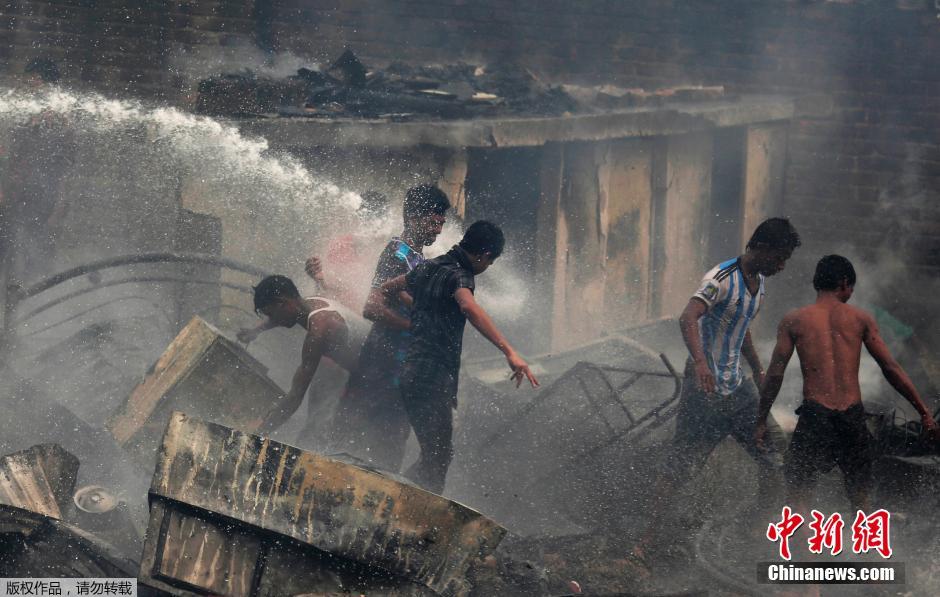 当地时间2015年2月25日,孟加拉国达卡,一处贫民窟发生火灾,造成一名两岁男童死亡,大量房屋被烧毁。