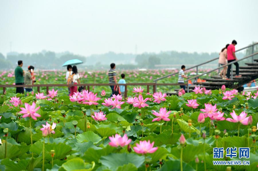 2014年7月6日,游客在河北省白洋淀景区荷花大观园参观游览。