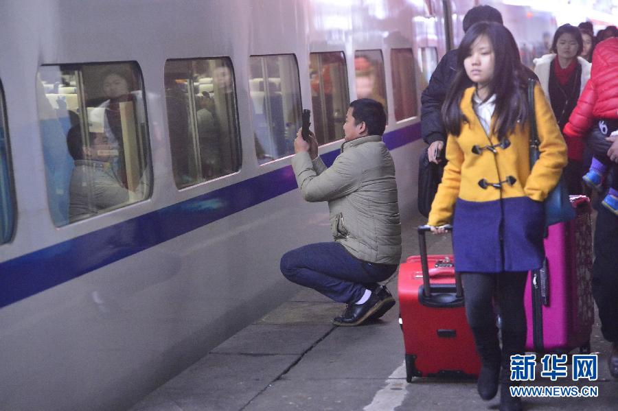 2月25日,在江西南昌火车站,一位乘客蹲在车窗前为即将离开的家人拍照。 新华社记者 周密 摄