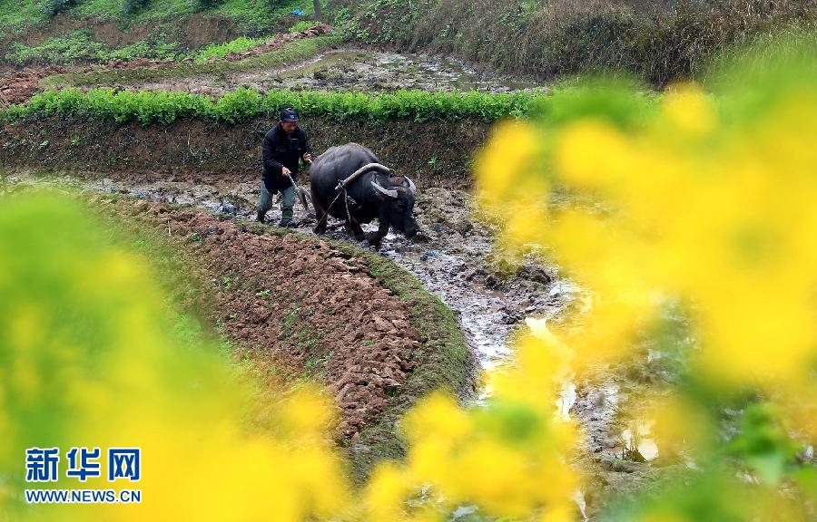 2月25日,四川省华蓥市明月镇三合团村农民在翻耕农田。春节过后,南方广大地区油菜花陆续飘香,陪伴在田间劳作的人们。 新华社发(邱海鹰 摄)