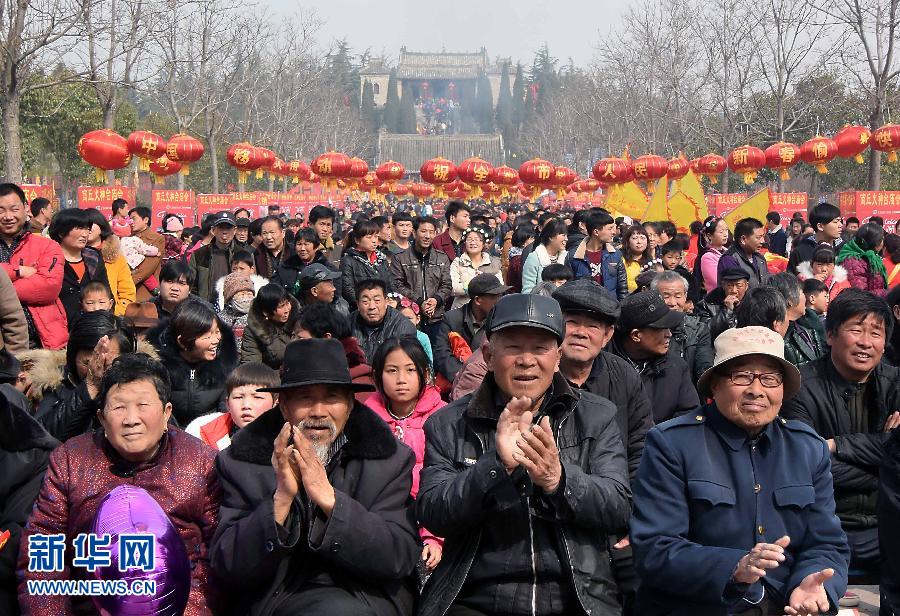 2月25日,在商丘火神台庙会内,游客们在戏楼前观看民俗表演。当日是农历正月初七,来自豫、鲁、苏、皖四省交界方圆百里的群众,纷纷来到河南省商丘市的火神台庙会现场,听大戏,看社火,祭祀火神,体验民俗。商丘火神台庙会,是祭祀火神阏伯的古庙会,距今已有上千年的历史。 新华社记者王颂摄