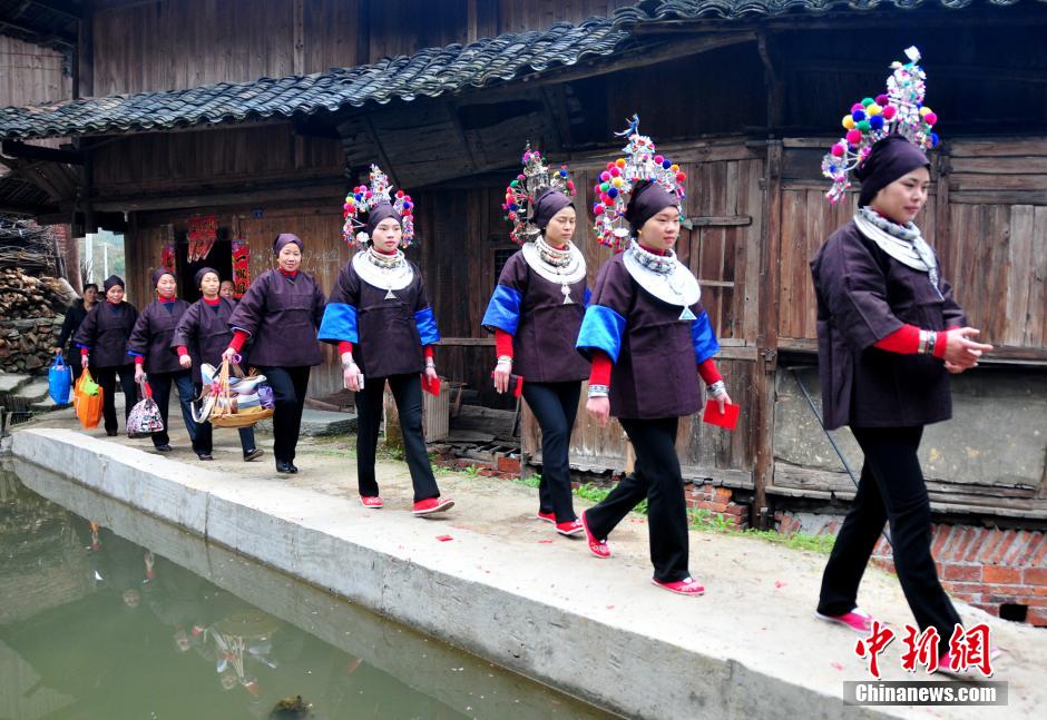 2月25日,广西三江侗族自治县林溪镇冠洞村,一送亲队伍挑着贺礼喜气洋洋将新娘送回娘家,送亲途中鞭炮齐鸣,引来沿途乡亲驻足围观,热闹非凡。送新娘是当地侗族传统婚礼中最隆重的仪式之一,送亲当日,新郎家会备齐红猪、酸鱼、酸鸭、糍粑、糯米及米酒等所需礼物,让特色的侗族婚礼为春节增添新春喜气。图为伴娘队伍行经广西三江侗族自治县林溪镇冠洞村公路。龚普康 摄